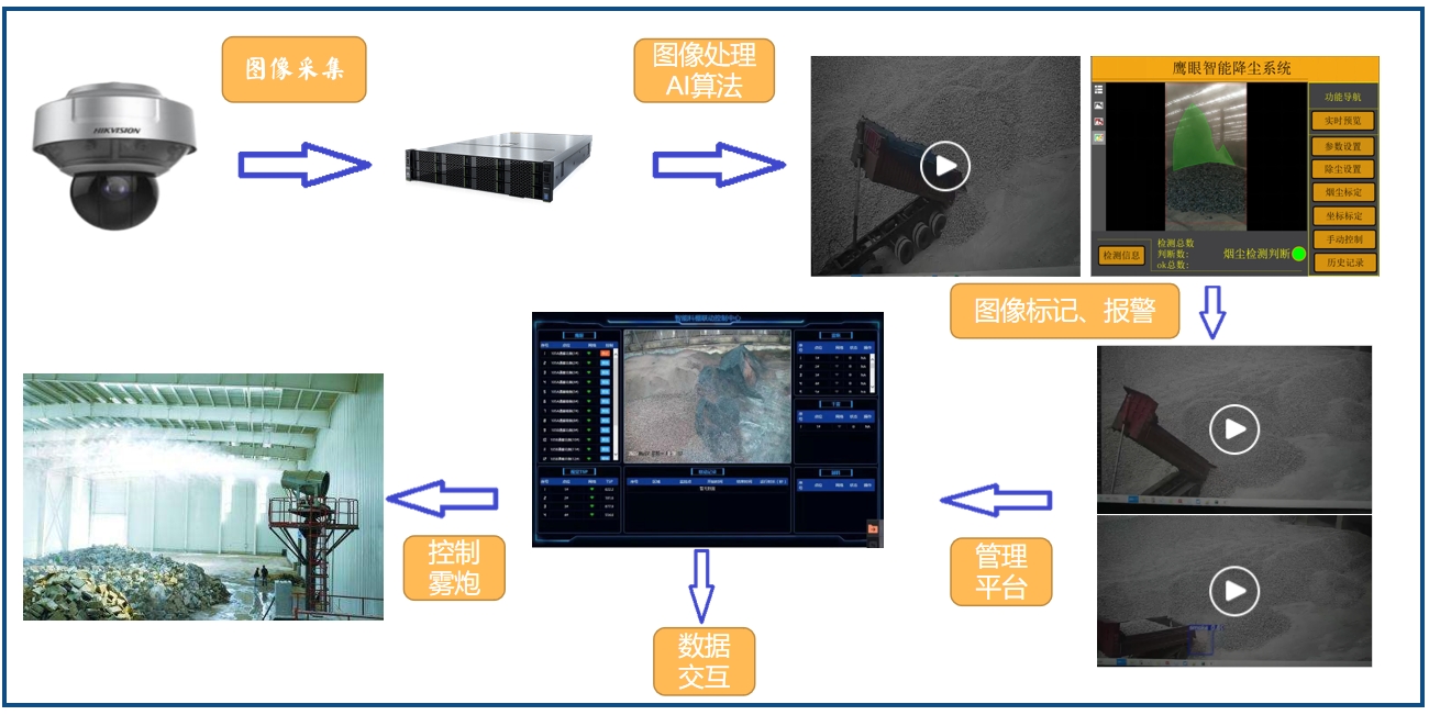智易時代的鷹眼霧炮聯(lián)動系統(tǒng)是一種針對企業(yè)粉塵污染問題的解決方案。該系統(tǒng)通過智能控制霧炮系統(tǒng),自動啟動并跟蹤作業(yè)車輛及粉塵煙羽進(jìn)行噴霧降塵。它能夠識別粉塵污染區(qū)域并加以抑制,實現(xiàn)24小時、自動跟蹤、對起塵區(qū)域可視化污染物進(jìn)行自動識別,減少粉塵污染的同時,有效的降低了治理成本。