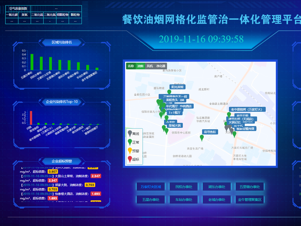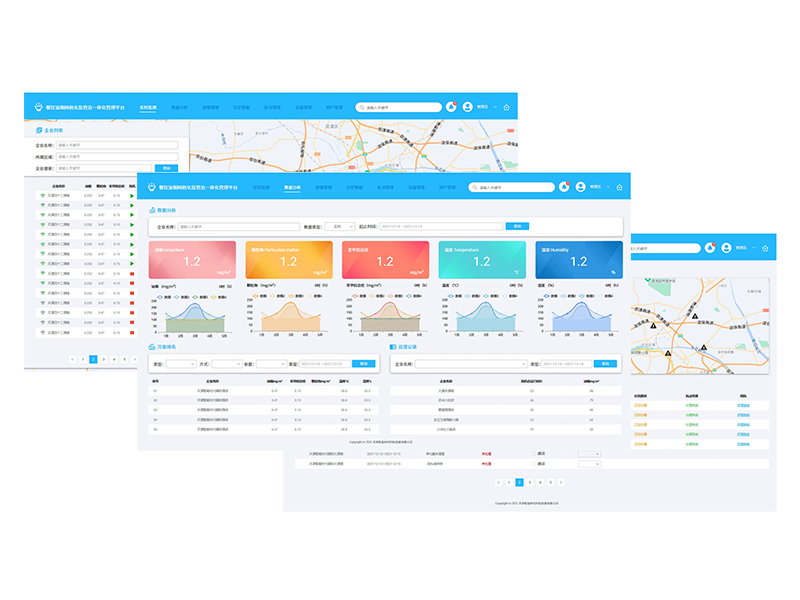 管理者在各企業(yè)進行油煙濃度限值預(yù)警值超標(biāo)值設(shè)置,一旦超過預(yù)警限值便會在平臺顯示黃色顏色變化,一旦超標(biāo),平臺首頁面會有超標(biāo)報警紅色彈窗,也可查詢預(yù)警企業(yè)的信息及油煙濃度,等其它設(shè)備異常信息。